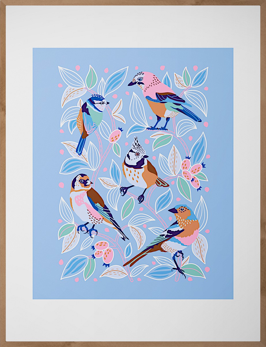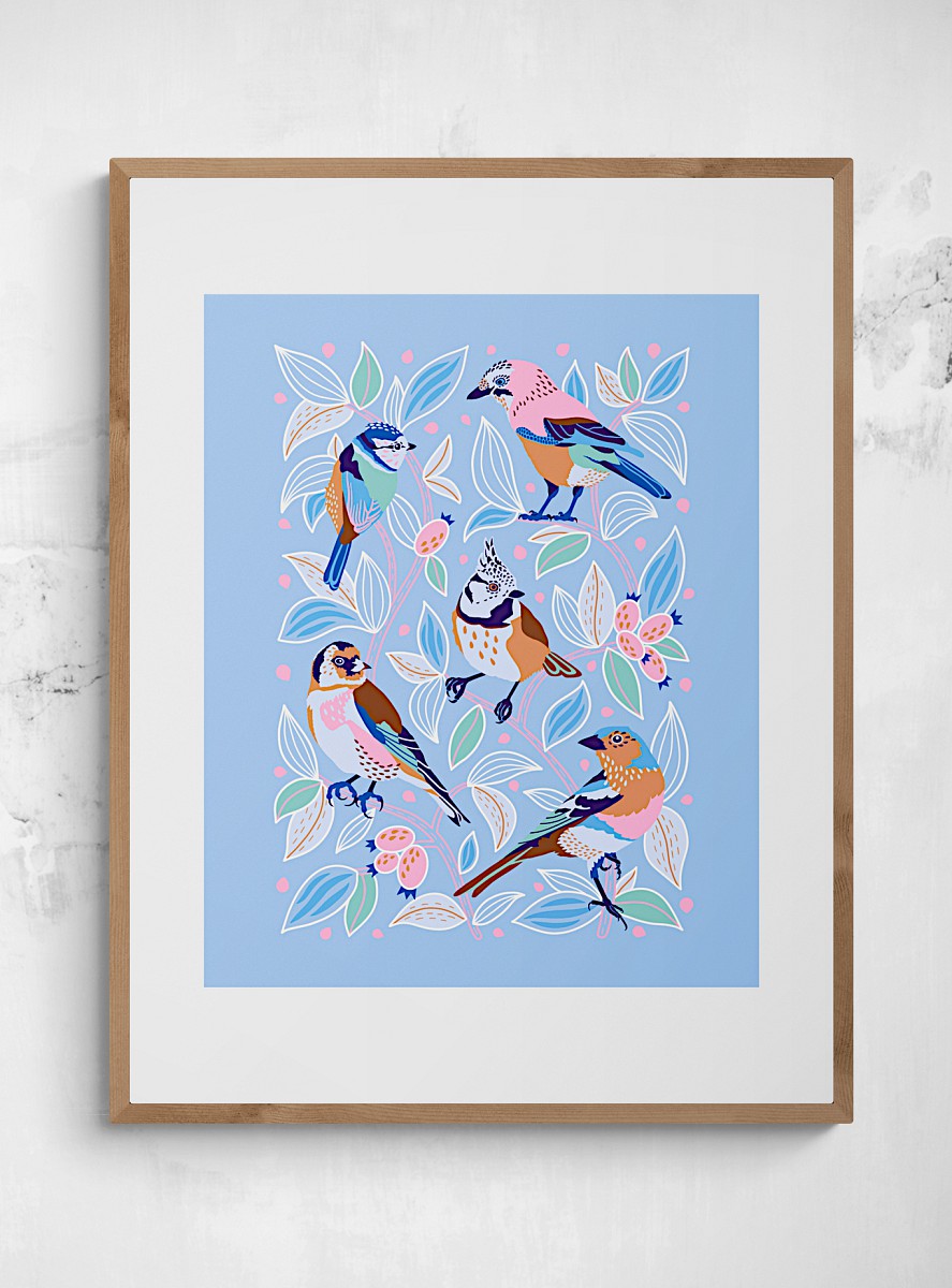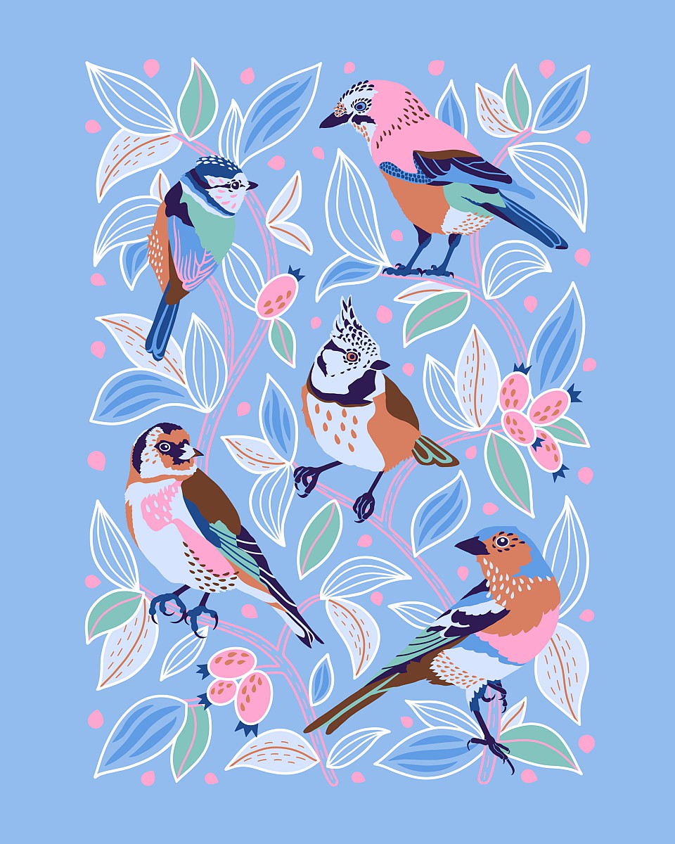 Die ersten Vogelmotive für die Illustration entstanden im Winter als farbenfrohe Antwort gegen das trübe Nebelgrau, im Frühling arbeitete ich die Komposition zu einer Baumnahaufnahme aus. Das Bild ist das erste in einer Reihe an Illustrationen, die Naturbegegnungen durch das Jahr hindurch aufgreifen.