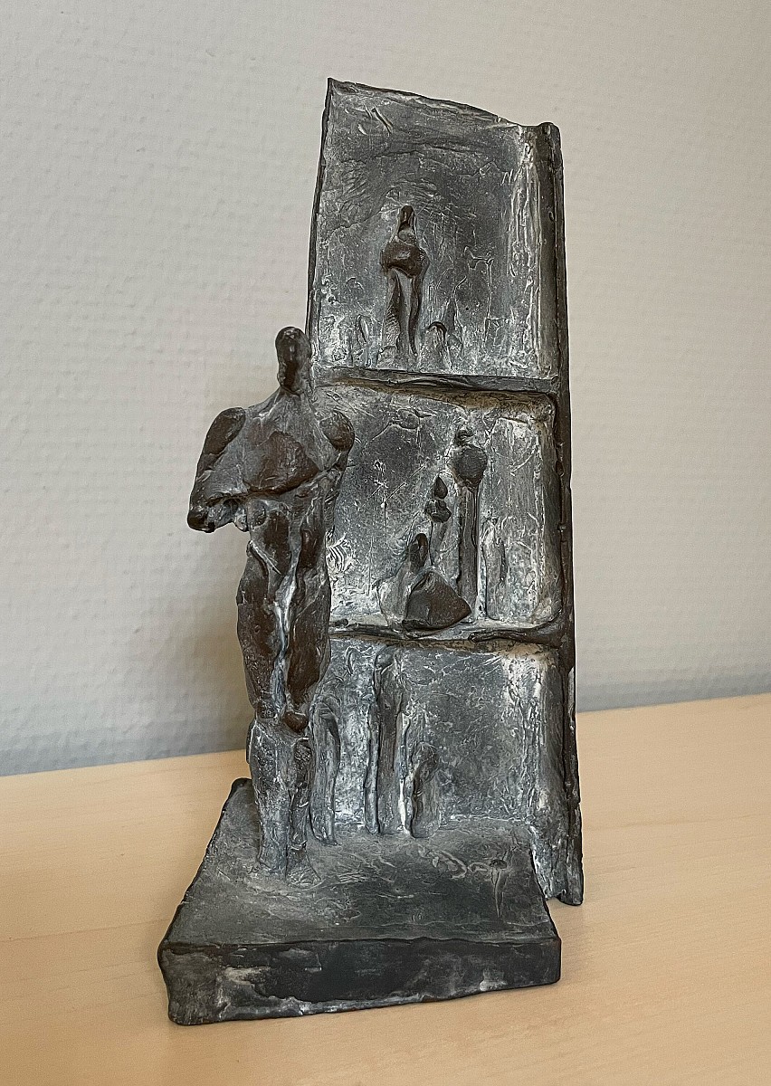 Diese kleine, einfache Bronze ist ein typisches Beispiel für ein zentrales Thema bei Doris Waschk-Balz: die Figur, immer der Mensch, im Bezug zum Raum und auch zu dann zumeist mehreren anderen in Gehäusen. Der einzelne allein – nicht weiter individualisiert – steht ihnen als Typ gegenüber oder ist - wie hier - abgewendet von der noch weniger personalisierten Menge in den Kammern der Wand, fast unterwegs … Seine leichte Schrägstellung gibt ihm Bewegung und Spannung, die von der Wand, der Menge weg will. Es ist eine dieser "Fingerübungen", wie Doris es nannte, die in Wachs leichthin modelliert wie eine Skizze einen einfachen Moment festhalten – der dann fest in Bronze gegossen den Betrachter doch als Momentaufnahme einer sehr menschlichen Situation berühren kann.