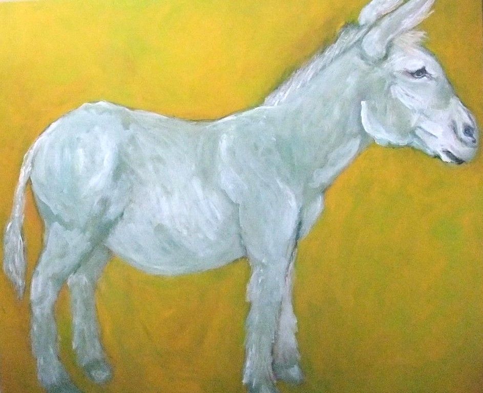 Den Anfang meiner Esel-Portraits bildeten ca. 2013/4 ein verunfallter goldener Rahmen einerseits, andererseits ein kleines Esel-Buch, auf das ich zufällig stieß. Der Hausesel Luciano ist seitdem in seiner fast authentischen Größe auf der Rückwand des goldenen Rahmens zu sehen. Schnell entstand die Idee, Esel in vielen Facetten vorzugsweise in Lebensgröße darzustellen und somit – entgegen diverser negativer Zuschreibungen – deren „wahren Kern“ zu zeigen.
